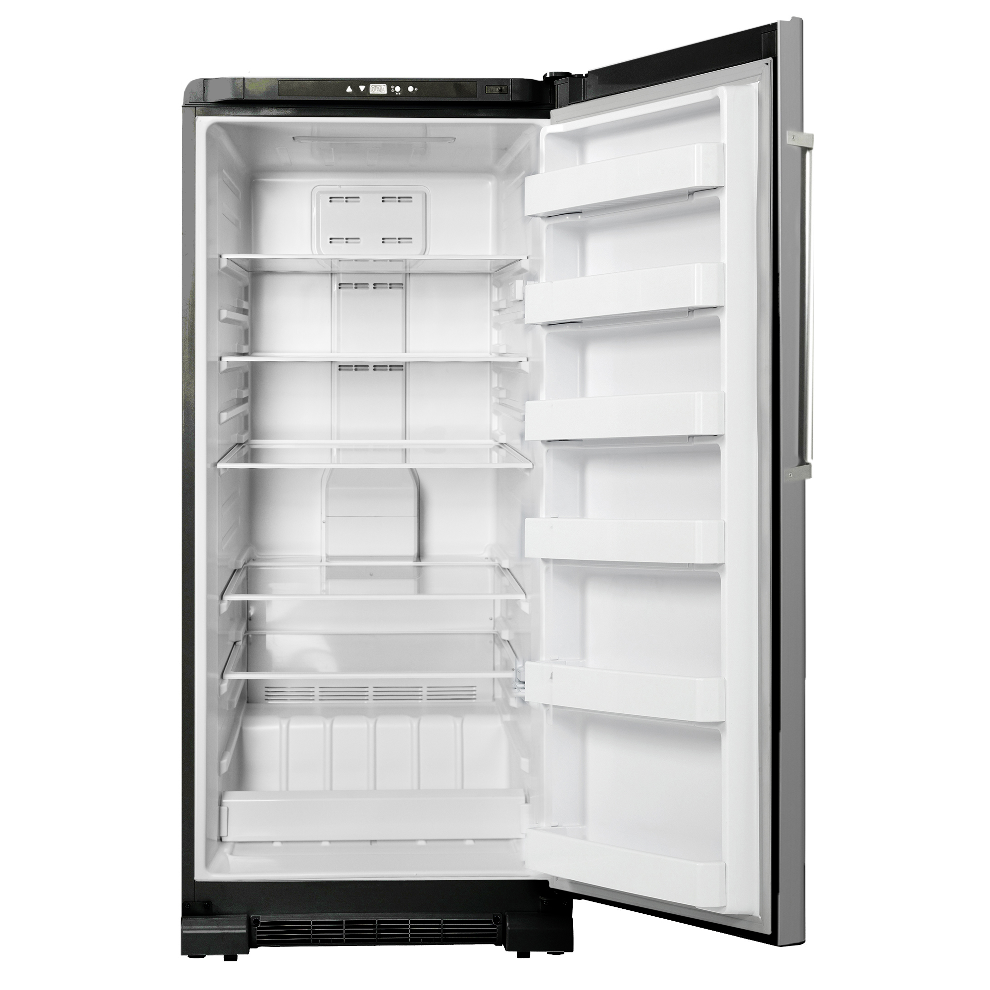 Description Stock up on your family's frozen favorites with a Danby Designer upright freezer available in stainless steel look or white, ideal for a basement, kitchen, or garage. Save on floor space with a stand-up freezer. The Energy-efficient design means it will help cut down your monthly electricity bills. This unit features six adjustable storage shelves and six in-door storages shelves for food organization. This model is garage ready and can perform in temperatures from 0°F to 110°F (-17°C to 43°C). Boasting 16.7 cu. ft. (473 L) of freezer space for frozen meals, meats, vegetables, and more, making it perfect for large families. This unit features a white interior and stainless look exterior design with a digital thermostat for maximum accuracy and a bright interior light that makes it an easy task to find your favorite frozen foods. A door ajar alarm and a high-temperature alarm help prevent food spoilage. Included is an industry-leading 5-year warranty on parts and labor with in-home service.