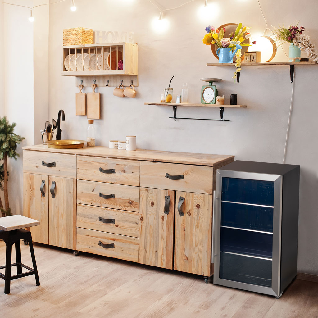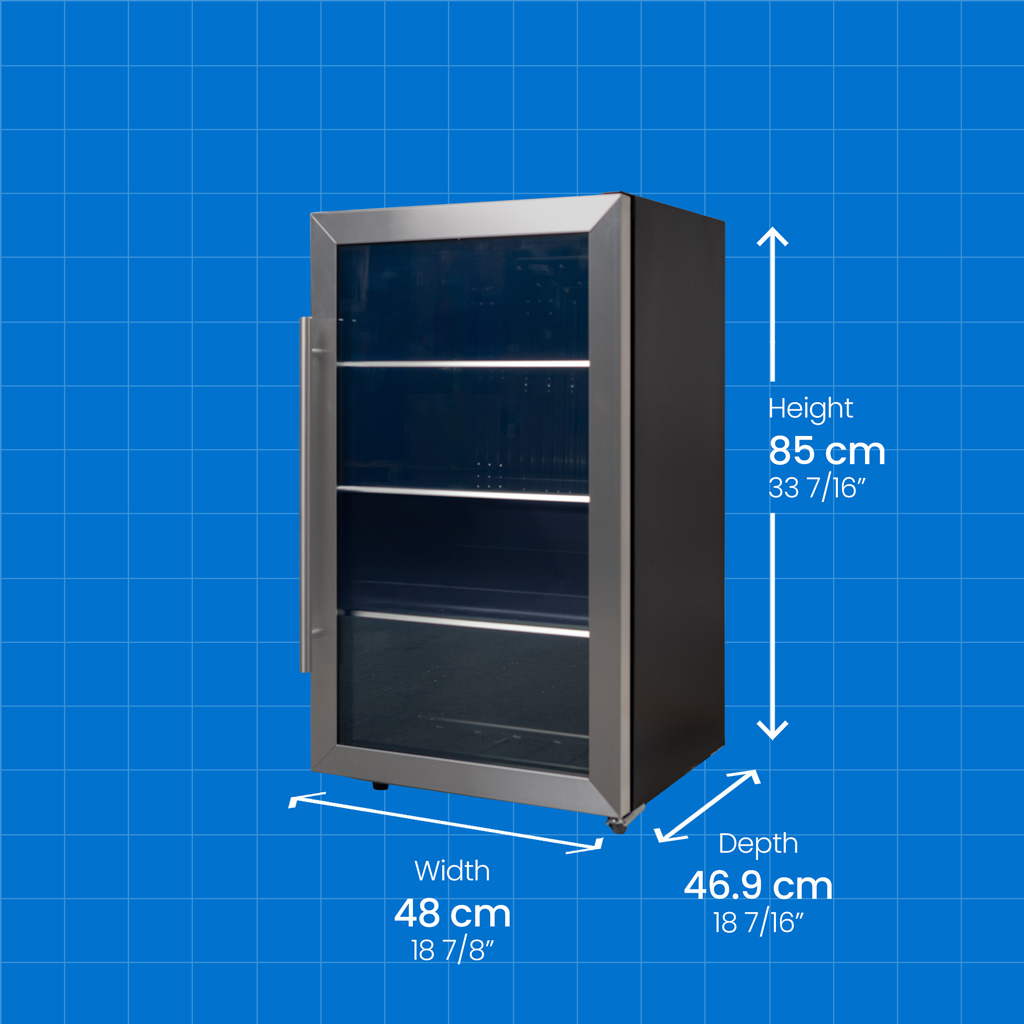- Customize the contents with three adjustable sturdy glass shelves to store different size beverages