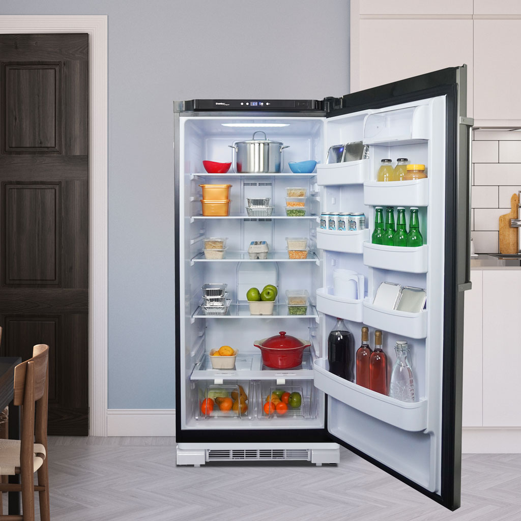 Bien que ce réfrigérateur élégant et spacieux de Danby puisse être assez grand pour y vivre, nous ne le recommandons pas. En revanche, nous le recommandons aux personnes qui recherchent un réfrigérateur fiable et sûr sans espace de congélation. Ce réfrigérateur complet offre 17 pieds cubes (480 litres) d’espace de stockage frais et sans givre. Ne laissez pas sa taille vous effrayer : des roulettes de qualité supérieure permettent de déplacer facilement le réfrigérateur. Cet appareil élégant est doté d’une porte unique avec une poignée intégrée et d’une charnière réversible intelligente qui vous permet de la régler pour une ouverture à droite ou à gauche. L’intérieur soigné et ordonné est éclairé par un puissant système d’éclairage LED qui facilite l’organisation des deux bacs à légumes recouverts de verre, des étagères de porte intégrées et des quatre étagères en verre réglables. Une alarme sonore intégrée est également incluse si la porte reste entrouverte. Il y a beaucoup de place pour les grandes bouteilles et cet appareil haut de gamme est accompagné d’une garantie de 18 mois sur les pièces et la main-d’œuvre et d’un service à domicile pratique.