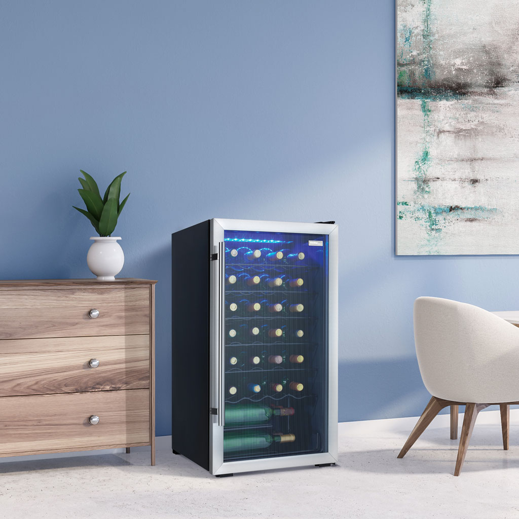 Vos vins rouges ou blancs préférés trouveront leur place dans ce superbe refroidisseur de vin autoportant, conçu pour conserver jusqu’à 30 bouteilles. Le refroidisseur à vin de 3,3 pi³ Danby Designer est un ajout élégant et sophistiqué à votre cuisine. La porte en verre trempé avec un cadre et une poignée en acier inoxydable apporte une touche moderne qui s’harmonise avec presque tous les décors. L’éclairage intérieur DEL bleu crée une lueur élégante qui met en valeur votre collection de vins, tout en éliminant la chaleur générée par une ampoule à incandescence. De plus, le thermostat permet de régler la température entre 6 °C et 14 °C (43 °F à 57 °F). Il est également doté d’une porte réversible, vous permettant de l’ouvrir du côté gauche ou droit, selon votre préférence.