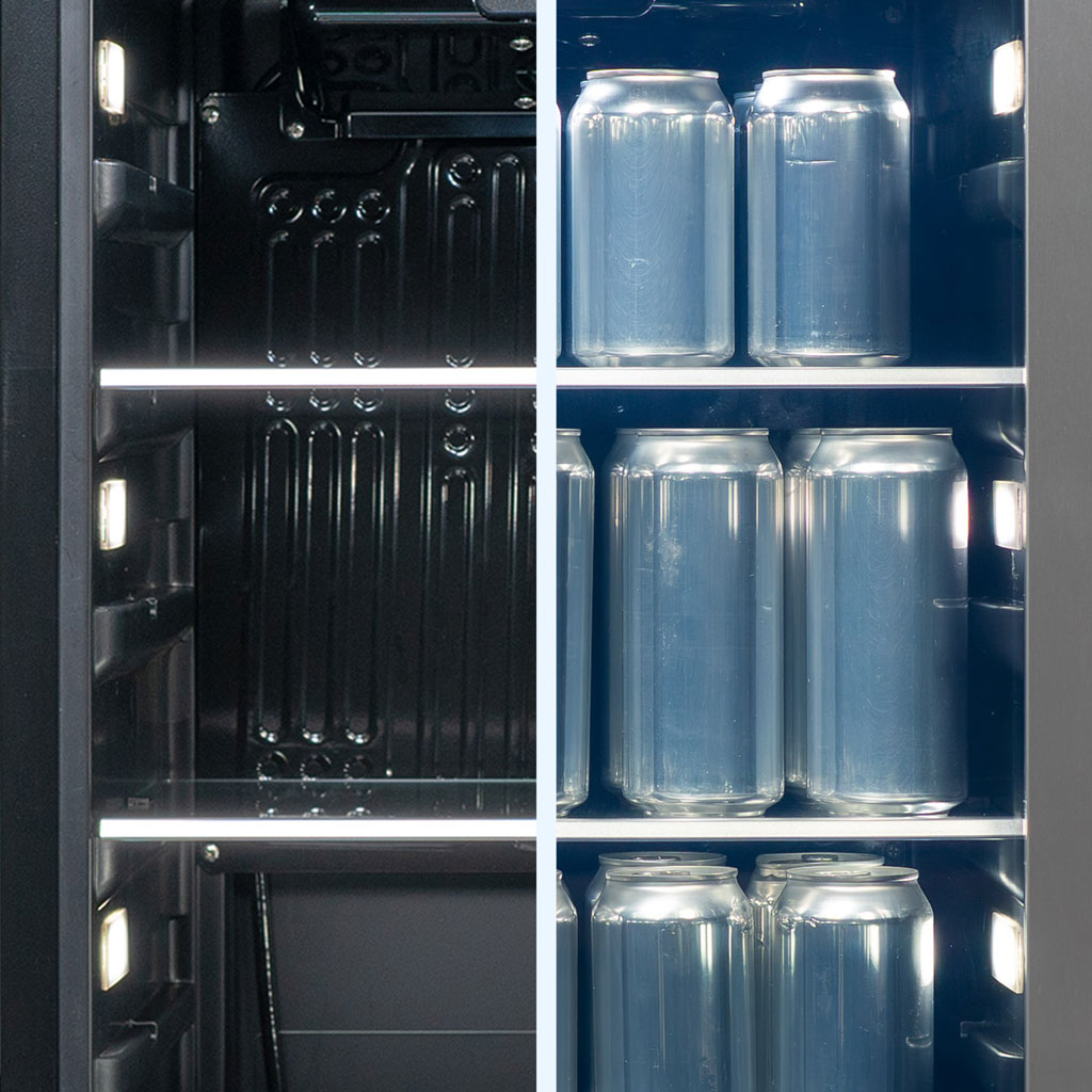 Lumières LED blanches à faible consommation d’énergie éclairent chaque étagère.