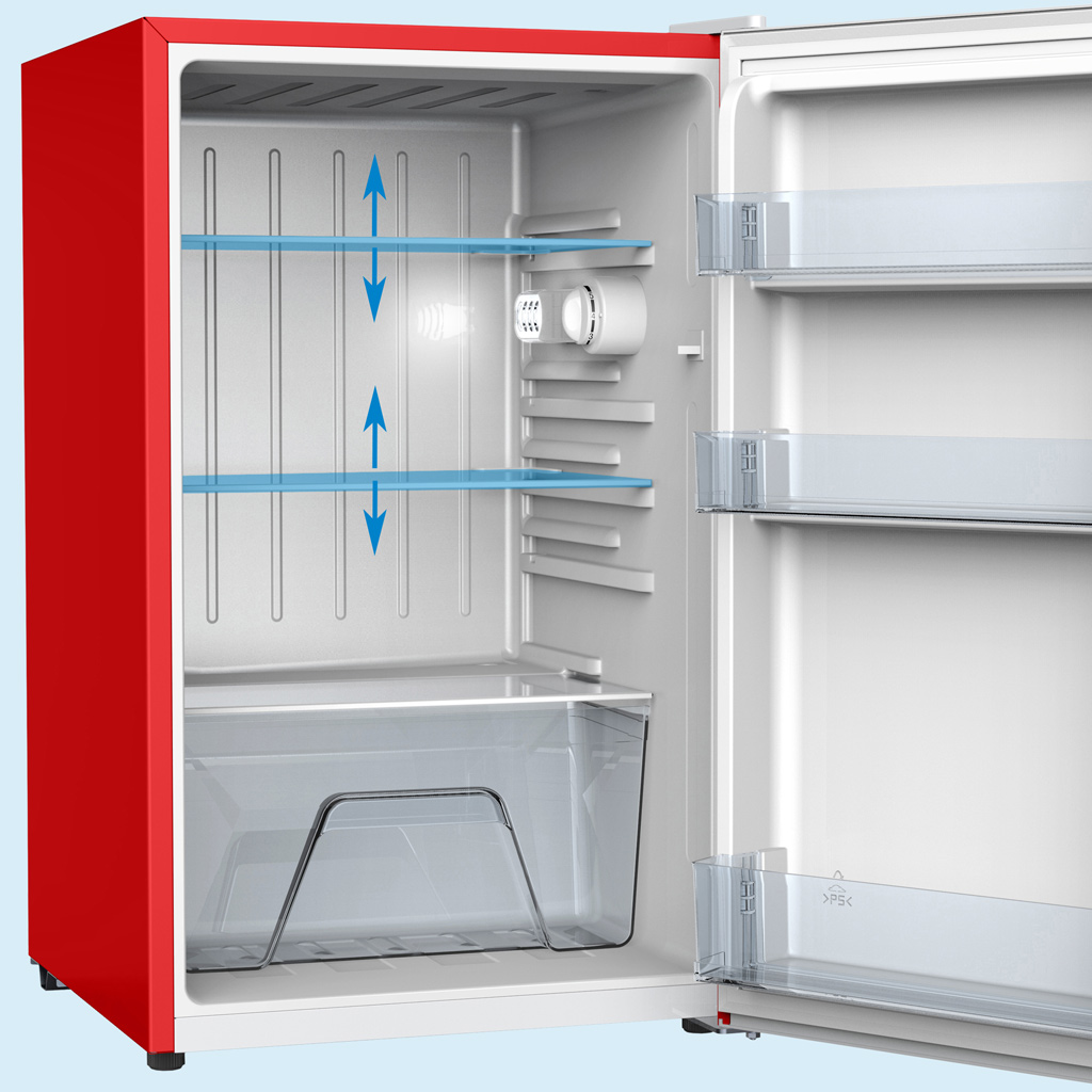 Adjustable glass shelves and integrated door shelving with tall bottle storage let you customize space for groceries, drinks, condiments, and jars. The vegetable crisper keeps produce fresh and organized in a compact footprint.
