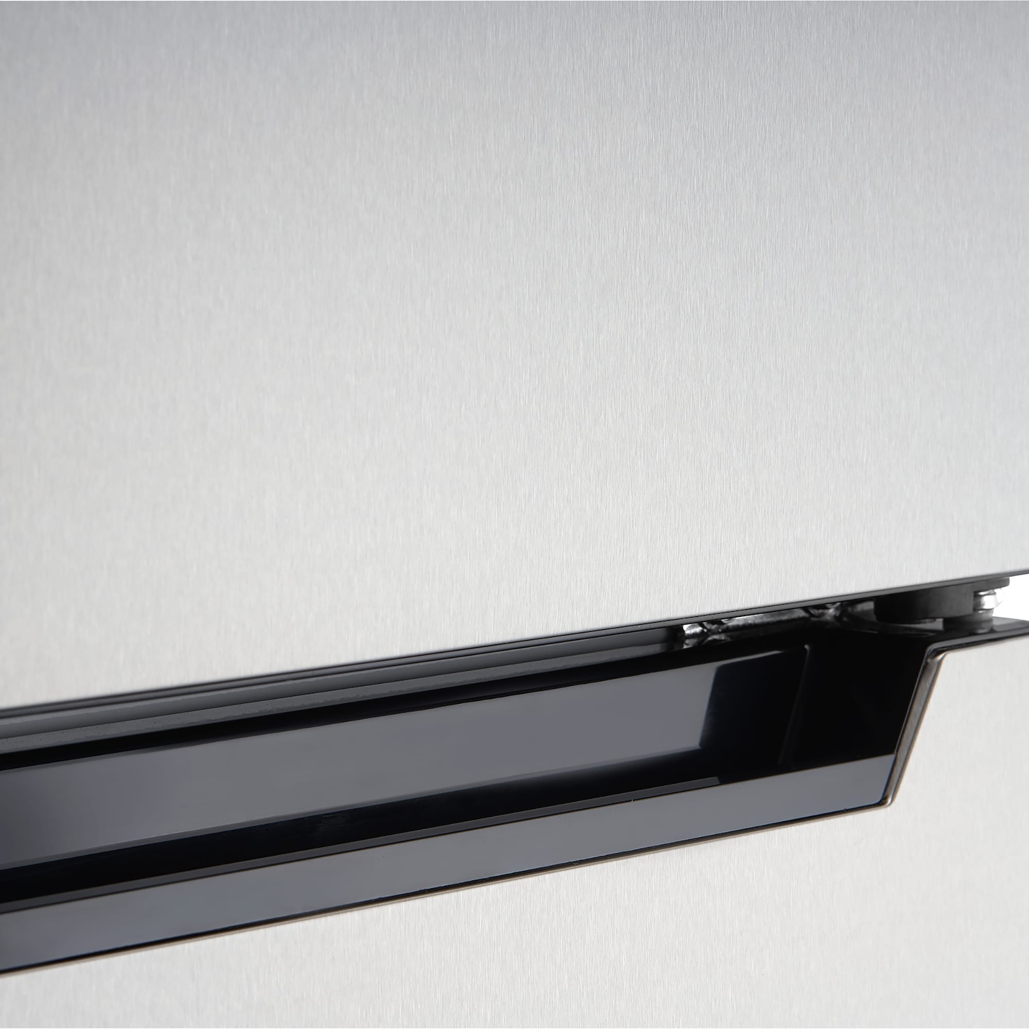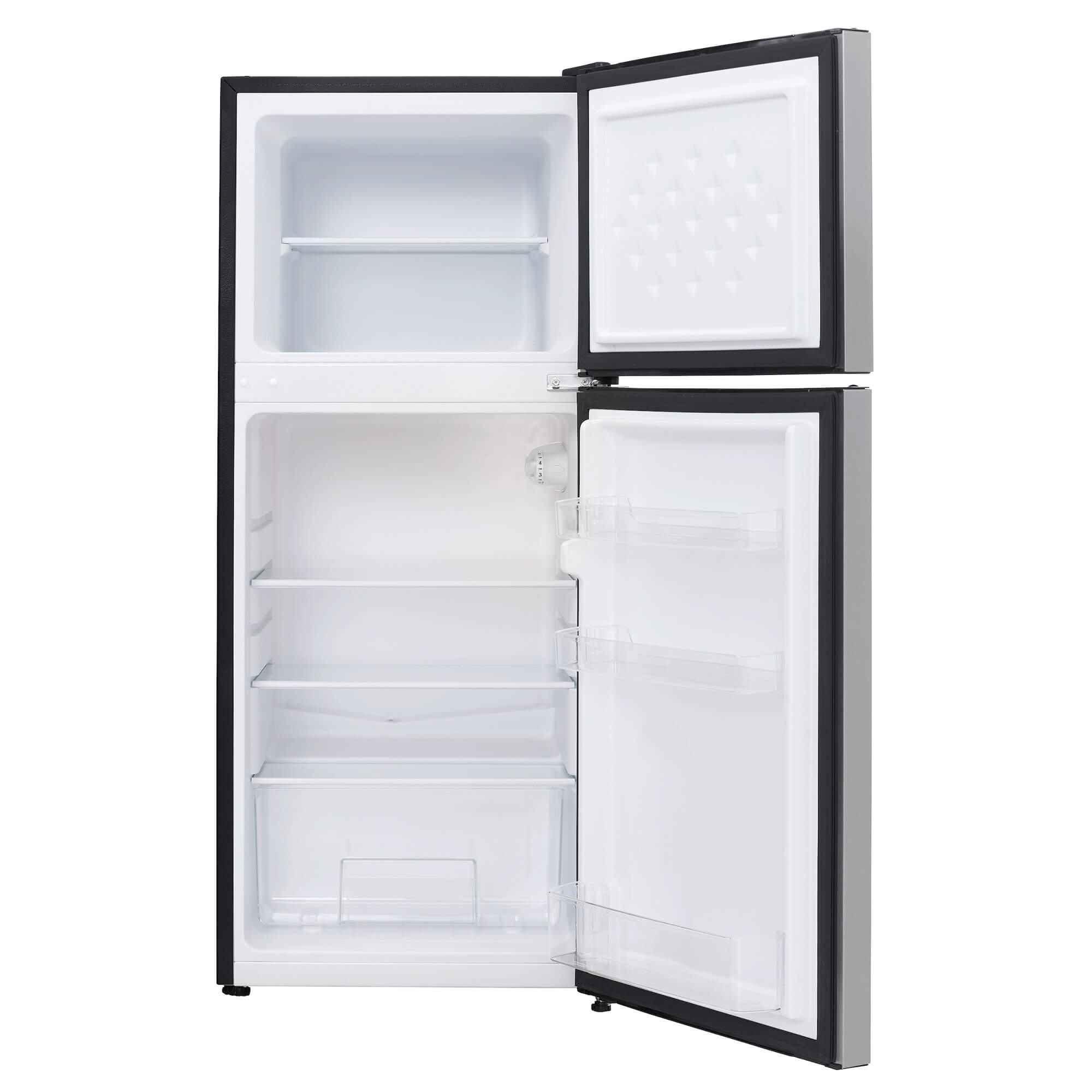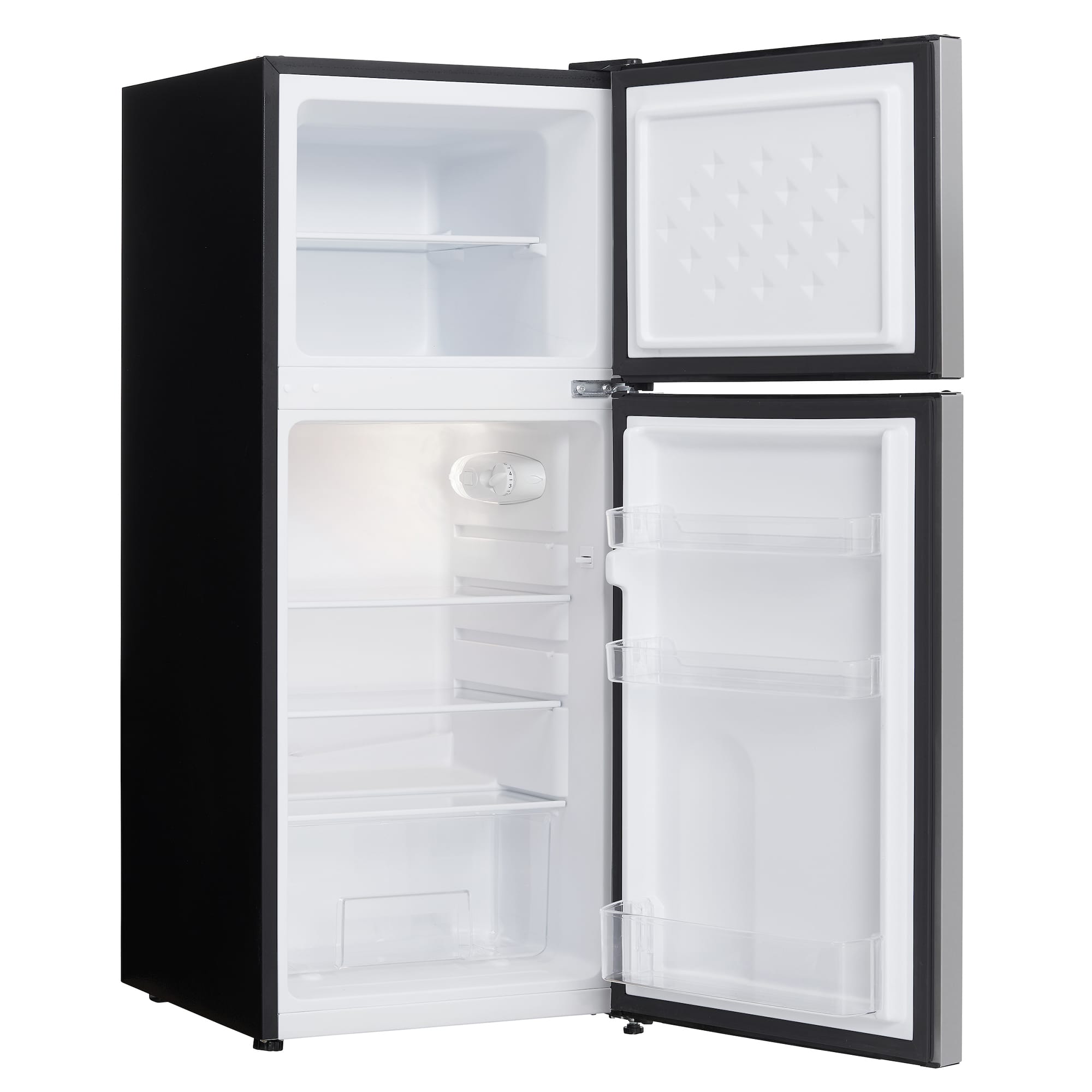 This 4.2 cu.ft. (118 L) top-mount compact refrigerator by Danby is perfect for small apartments, rec rooms, home bars, and cottages. This stainless steel dual-door fridge comes equipped with one full-width freezer section and a large fridge section with 2 full-width and 1-1/2 width adjustable glass shelves. This mini fridge fits in almost any space with its reversible door hinge for right or left-hand opening. The operation of this top-mount fridge is made simple with a mechanical thermostat and manual defrost. And you won’t have to worry about not enough storage space since this compact comes with one big vegetable crisper, integrated door shelves, and tall bottle storage.