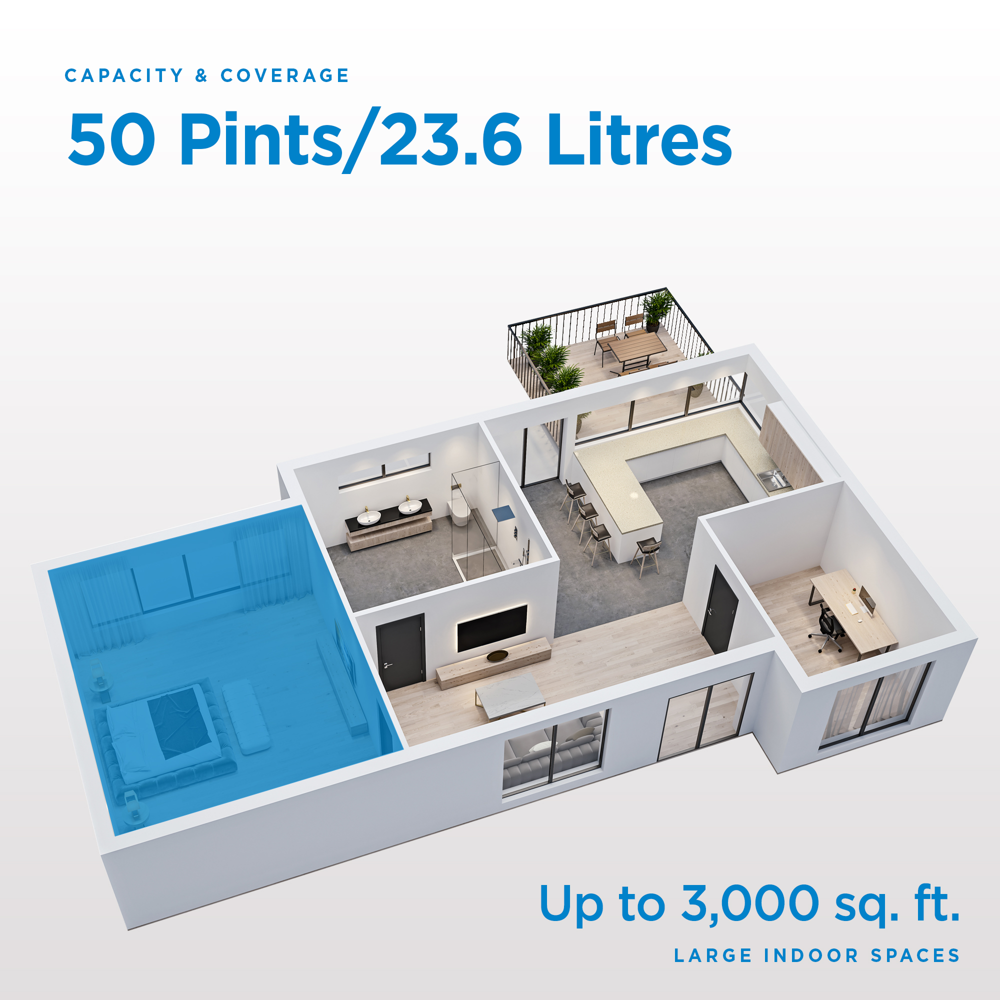 • 50 Pint (23.6 L) Dehumidifier: Controls humidity in spaces up to 3,000 sq. ft.