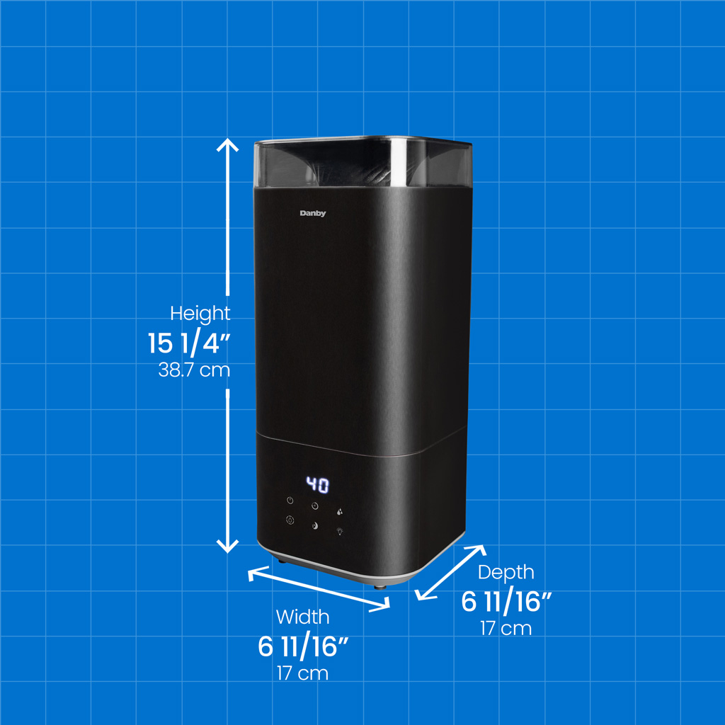 Create a soothing atmosphere at home with the Danby 5L Top Fill Ultrasonic Humidifier. Dry weather and indoor heat can wear on your body and result in uncomfortable chapped lips, dehydration, and dry skin. Cool, soothing mist brings relief from these seasonal discomforts by humidifying your living spaces. Deliver that relief anywhere you need it, your bedroom, great room, office, or any space up to 325 sq. ft. Designed with ultrasonic technology, this model uses ultrasonic vibration to mist water into tiny particles and diffuses it into the air increasing relative humidity of the space. Adjustable humidity levels combined with three digital settings for mist, allow you to tailor the humidification process, resulting in true home comfort. Other features include a nightlight or sleep setting, 360-degree output and a timer option making this unit fully customizable and long running. Enjoy the benefits of essential oils by utilizing the aroma diffuser feature and create a therapeutic aroma experience. Maintenance is easy with its washable and reusable filter and easy to clean reservoir. A complimentary second filter is included.