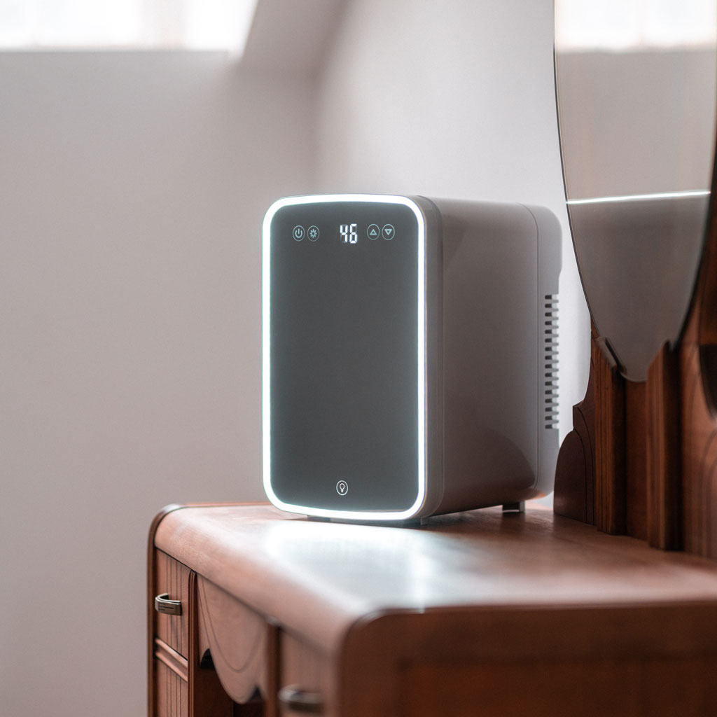 • White Mini Fridge, perfect for storing skincare and makeup items